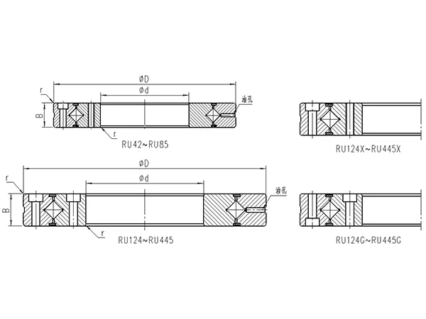 RU型 外圈和内圈均为整体结构,同时带有安装孔,安装使用方便。适用内圈和外圈旋转有精度要求的场合。